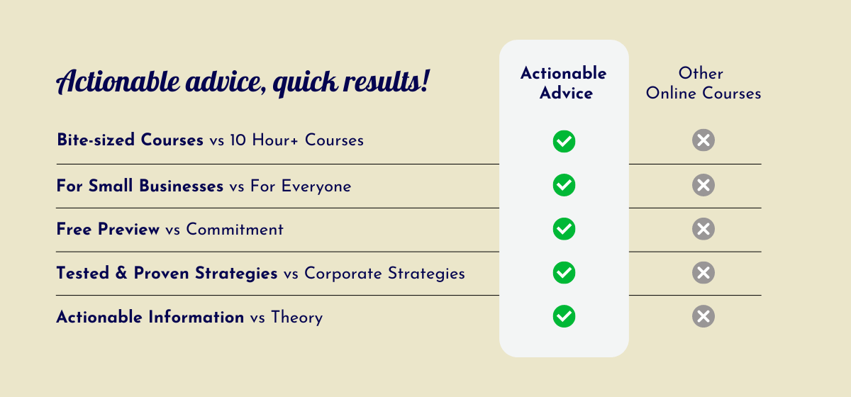 Actionable Advice offers online courses and consulting for small businesses. You can choose from several free resources and online courses to grow your small business.